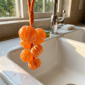 העיצוב הייחודי בצורת תפוזים קטנים מחוברים לאשכול יוצר מראה דקורטיבי יוקרתי, כזה שנראה יותר כמו קישוט מאשר סבון.